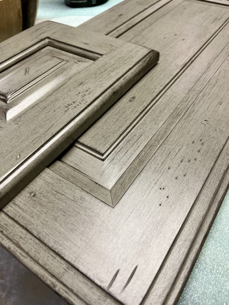 Once the bases of your cabinets are cleaned, masked, and coated our team moves off site to work on the most visible portion of your cabinets: the doors and drawer faces.