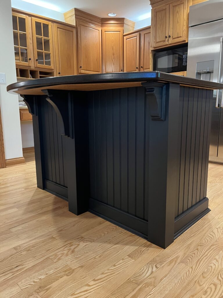 - Note: If you have a darker color going on your island or cabinets, we’ll use a dark primer, usually dark gray or blue, which allows us to reach the saturated color you’re looking for. It can be jarring to see a different color than your agreed upon shade be applied, but trust the process!